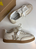 Ces baskets associent sobriété et élégance. Réalisées en mesh blanc, elles sont rehaussées d’un monogramme en similicuir texturé or pour une touche lumineuse.