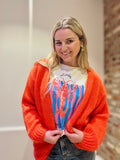 Gilet rouge orangé au style cozy et tendance, parfait pour ajouter une touche de couleur aux tenues.